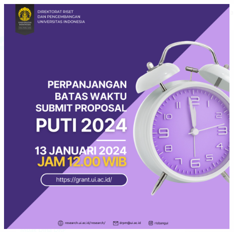 Sehubungan dengan perbaikan sistem RIMA (grant.ui.ac.id), bersama ini kami sampaikan bahwa Direktorat Riset dan Pengembangan (Dit. Risbang) memperpanjang waktu pengumpulan proposal Hibah Riset UI 2024 melalui RIMA (grant.ui.ac.id) hingga tanggal 13 Januari 2024 pukul 12.00. Melalui surat ini, kami sampaikan kembali tautan panduan Hibah PUTI 2024 sebagai berikut: https://research.ui.ac.id/pengumuman/hibah-riset-ui-2024/. Demikian informasi ini kami sampaikan. Atas...Read More