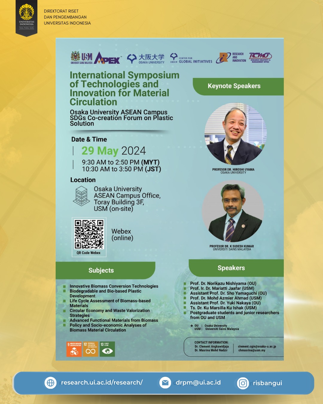 Osaka University dibawah proyek ASEAN Campus bekerja sama dengan Universiti Sains Malaysia (USM) menyelenggarakan International Symposium of Technologies and Innovation for Material Circulation – Osaka University ASEAN Campus SDGs Co-creation Forum on Plastic Solution secara hybrid pada: