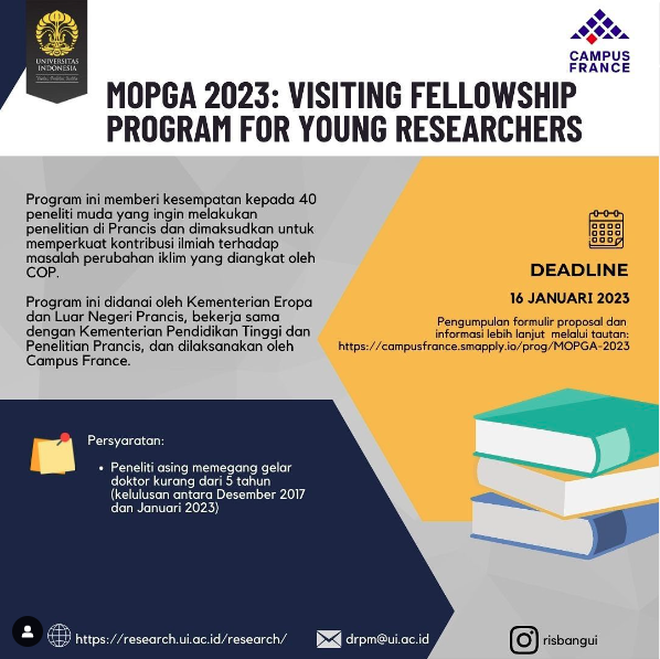 Program ini memberi kesempatan kepada 40 peneliti muda yang ingin melakukan penelitian di Prancis dan dimaksudkan untuk memperkuat kontribusi ilmiah terhadap masalah perubahan iklim yang diangkat oleh COP. Program ini didanai oleh Kementerian Eropa dan Luar Negeri Prancis, bekerja sama dengan Kementerian Pendidikan Tinggi dan Penelitian Prancis, dan dilaksanakan oleh Campus France. Persyaratan: * Peneliti...Read More