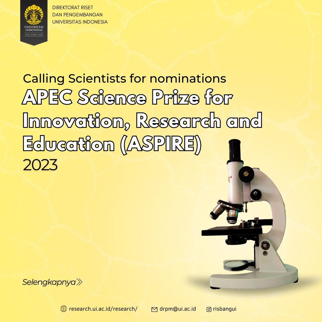 ASPIRE (APEC Science Prize for Innovation, Research and Education) 2023 mengusung tema ‘inclusive science, technology, and innovation for a resilient and sustainable environment’ diperuntukkan untuk ilmuwan muda dengan usia maksimal 40 tahun yang berkomitmen untuk berkolaborasi dalam taraf internasional.