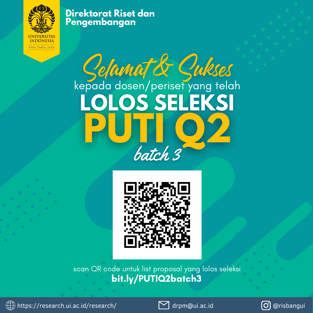 Sehubungan dengan diselenggarakannya seleksi proposal Hibah Riset Universitas Indonesia Tahun 2022 (batch 3), bersama ini kami sampaikan daftar proposal yang lolos seleksi untuk skema Publikasi Terindeks Internasional (PUTI) Q2 batch 3. Direktorat Riset dan Pengembangan mengucapkan selamat pada pengusul yang telah lolos seleksi Hibah PUTI Q2 batch 3. Pendanaan hibah tersebut terbagi atas dua tahap, yaitu: