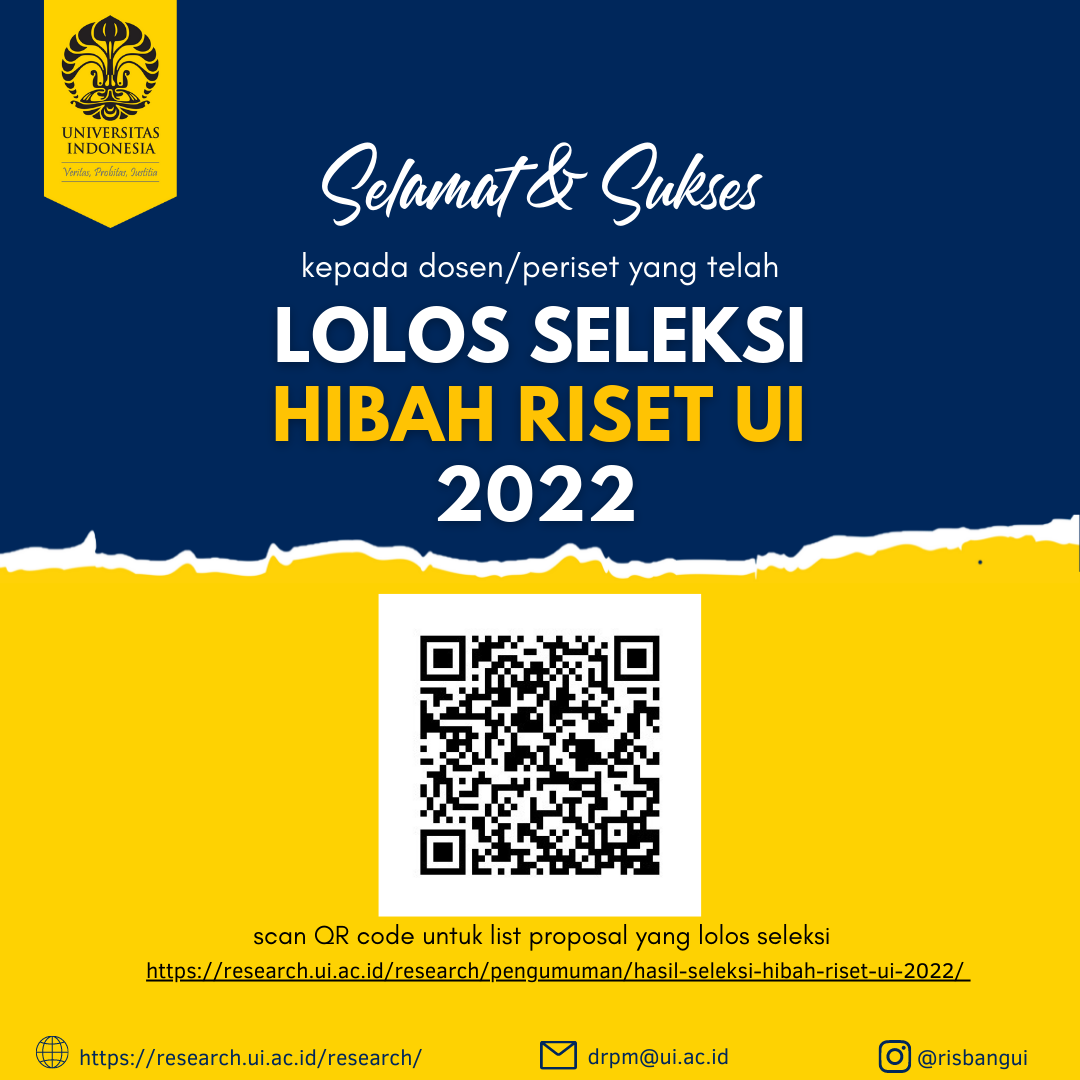 Sehubungan dengan telah diselenggarakannya seleksi proposal Hibah Riset Universitas Indonesia Tahun 2022, bersama ini kami sampaikan daftar proposal yang lolos seleksi untuk skema: