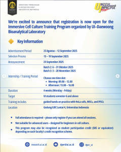 We’re excited to announce that registration is now open for the Immersive Cell Culture Training Program organized by UI–Daewoong Bioanalytical Laboratory 🎓🧬