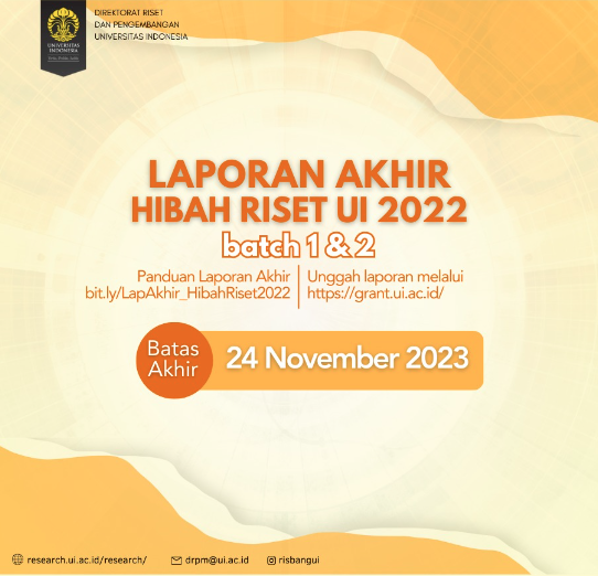 Sehubungan dengan akan berakhirnya pelaksanaan Hibah Riset UI Tahun 2022, bersama surat ini kami meminta bantuan Bapak/Ibu untuk menyampaikan kepada para periset penerima Hibah Riset UI Tahun 2022 untuk melengkapi laporan akhir PUTI tahun 2022. Kami mohon para periset dapat mengunggah softcopy laporan ke RIMA (grant.ui.ac.id) selambat-lambatnya pada 24 November 2023. Terlampir panduan penyusunan laporan akhir hibah dan panduan pengunggahan laporan ke RIMA.