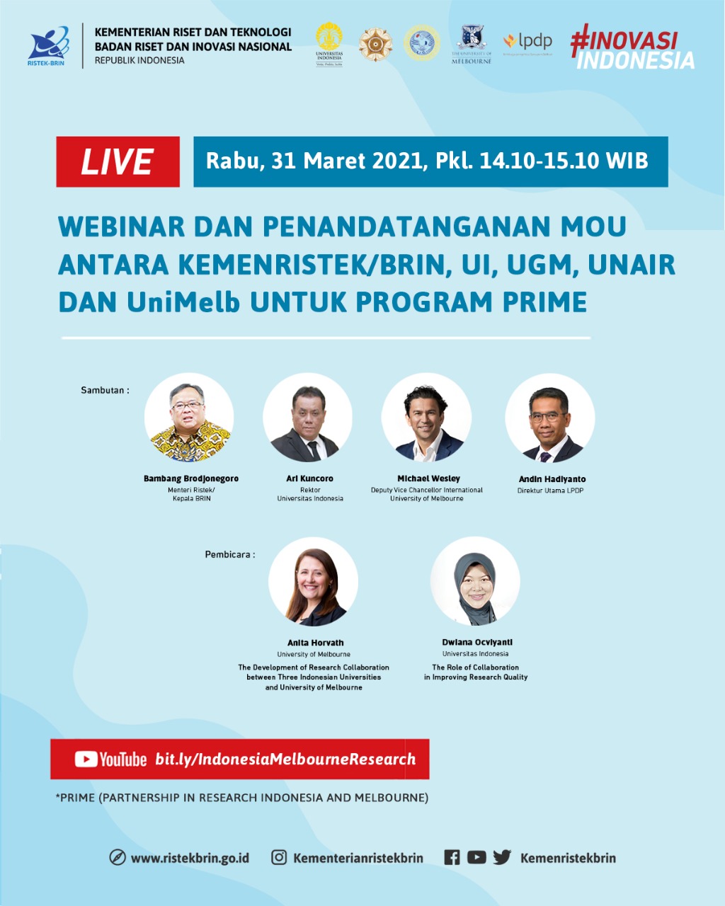 Universitas Indonesia mengundang partisipasi Bapak/Ibu/Saudara/i pada “Webinar dan Penandatanganan MoU antara Kemenristek/BRIN, UI, UGM, Unair, dan the University of Melbourne untuk Program PRIME”