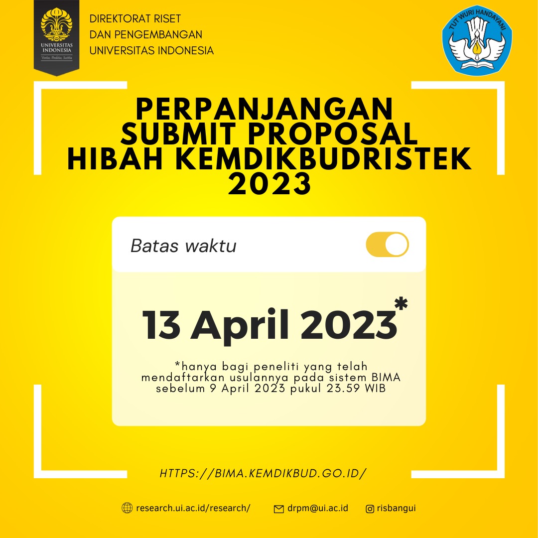 Batas waktu Submit Proposal Hibah Kemdikbudristek Tahun 2023 diperpanjang hingga 13 April 2023. Perpanjangan hanya bagi peneliti yang telah mendaftarkan usulannya pada sistem BIMA sebelum 9 April 2023 pukul 23.59 WIB.