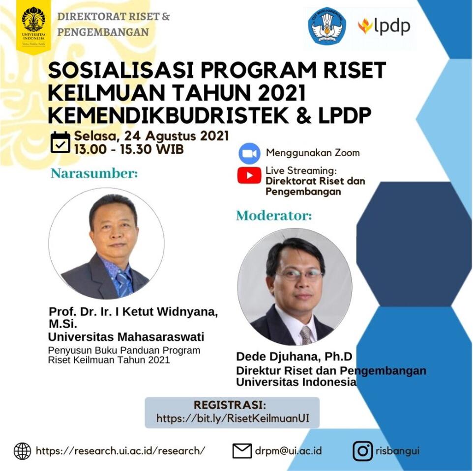 Direktorat Riset dan Pengembangan (RISBANG UI) mengundang partisipasi Bapak dan Ibu pada acara Sosialisasi Program Riset Keilmuan Tahun 2021 Kemendikbudristek & LPDP.