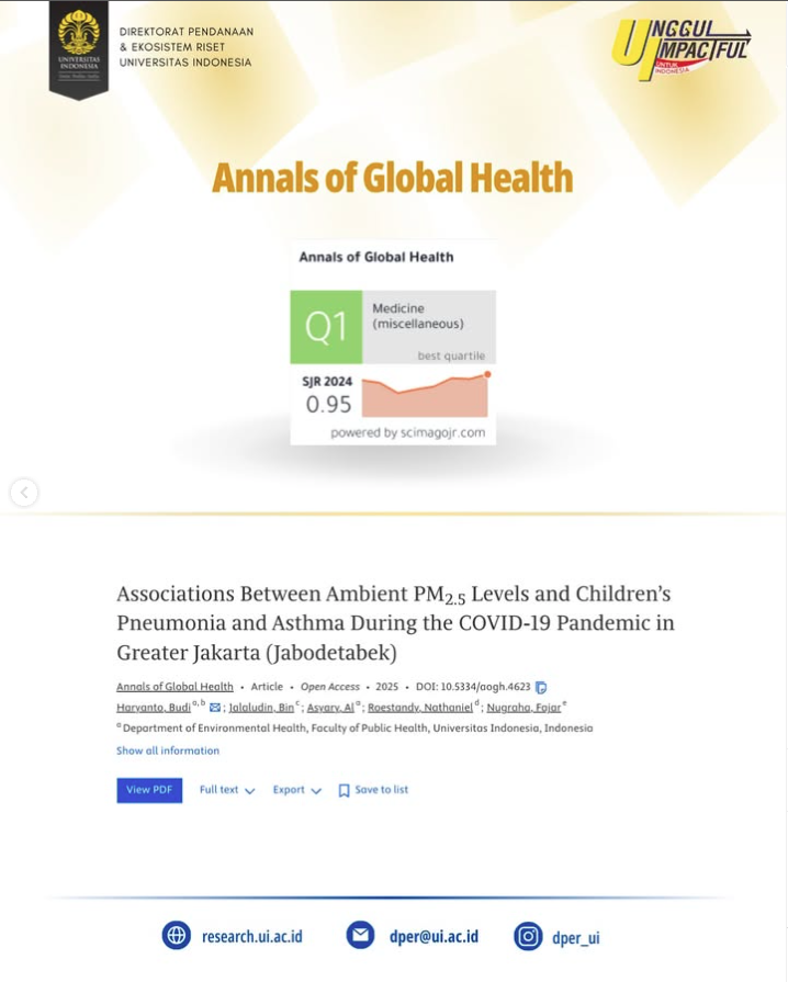 #UniversitasIndonesia #UI #FKMUI #DirektoratRisetUI #RisetUI #PenelitiUI #UIResearch #KesehatanMasyarakat #PolusiUdara #PM25 #Asma #PneumoniaAnak #KesehatanLingkungan #EnvironmentalHealth #AirPollution #PublicHealthResearch