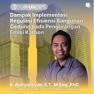 Dosen dan peneliti di Fakultas Teknik Universitas Indonesia, Ir. Ardiyansyah, S.T.,M.Eng.,PhD., bekerjasama dengan United Nations Office for Project Services (UNOPS) mengkaji dampak regulasi Peraturan Menteri PUPR RI No. 21 Tahun 2021 Tentang Penilaian Kinerja Bangunan Gedung Hijau terhadap pengurangan emisi karbon di Indonesia.