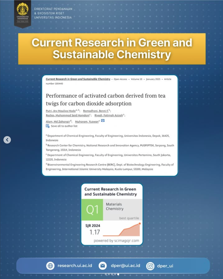 Dosen dan guru besar di bidang pemodelan dan simulasi proses kimia Universitas Indonesia, Prof. Dr. rer. nat. Ir. Yuswan Muharam, M.T., Fakultas Teknik (FT UI) melakukan kajian yang berjudul ” Performance of Activated Carbon Derived from Tea Twigs For Carbon Dioxide Adsorption”