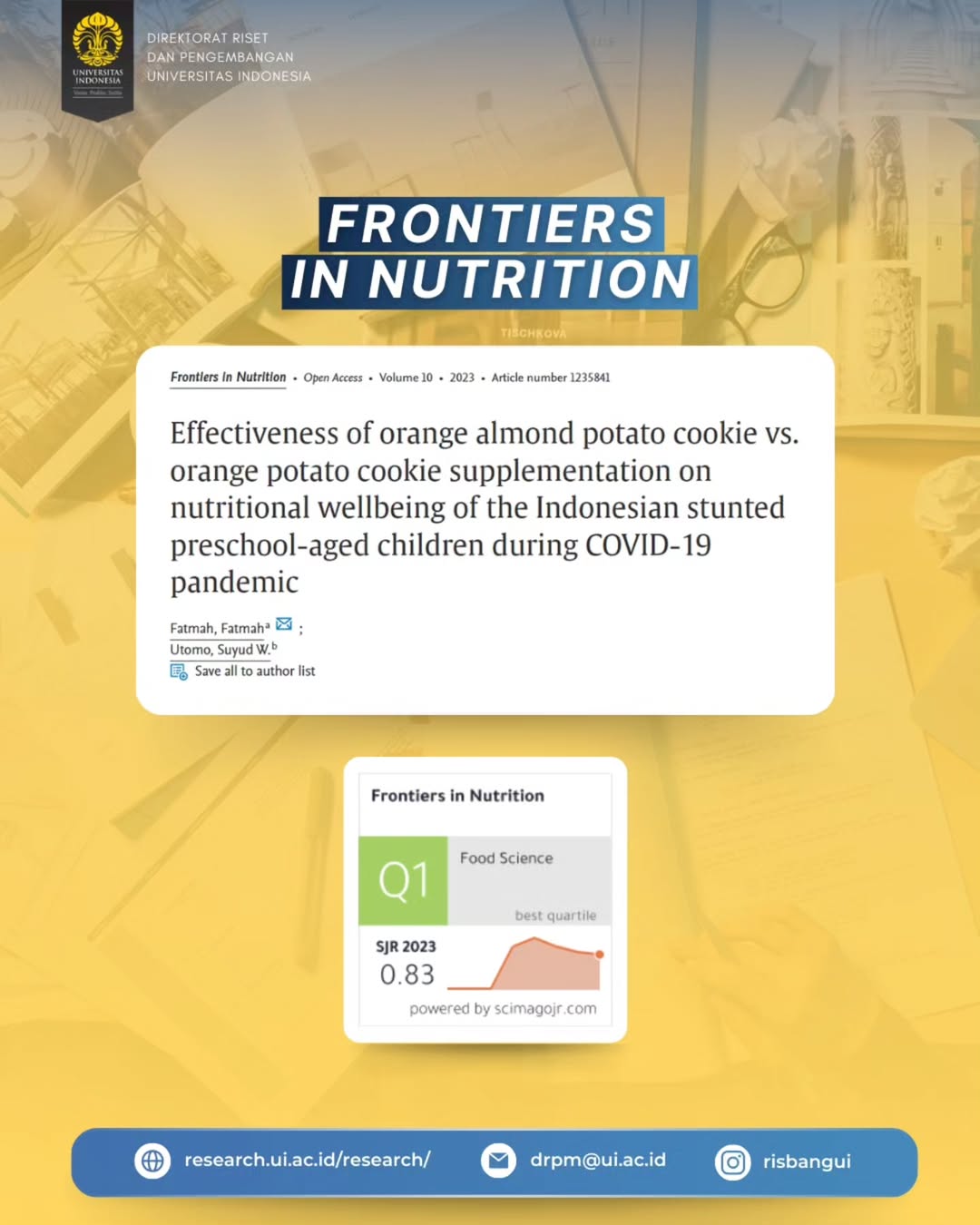 Dosen dan Peneliti di Sekolah Ilmu Lingkungan Universitas Indonesia, Dr. Fatmah, SKM., M.S, melakukan kajian yang berjudul “Suplementasi Cookies Kentang Almond Jeruk terhadap Status Gizi Balita Stunting di Masa Pandemi COVID-19”